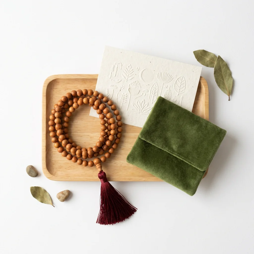 The perfect beginner’s meditation kit. Genuine 108-bead Sandalwood Mala, silk velvet pouch, and printed meditation guide card.
