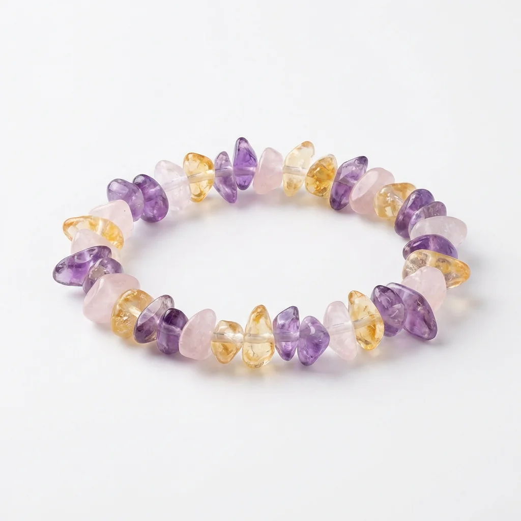 Get all the benefits in one! Mixed crystal chip bracelet blends Amethyst, Rose Quartz, Citrine and more for rainbow healing energy.