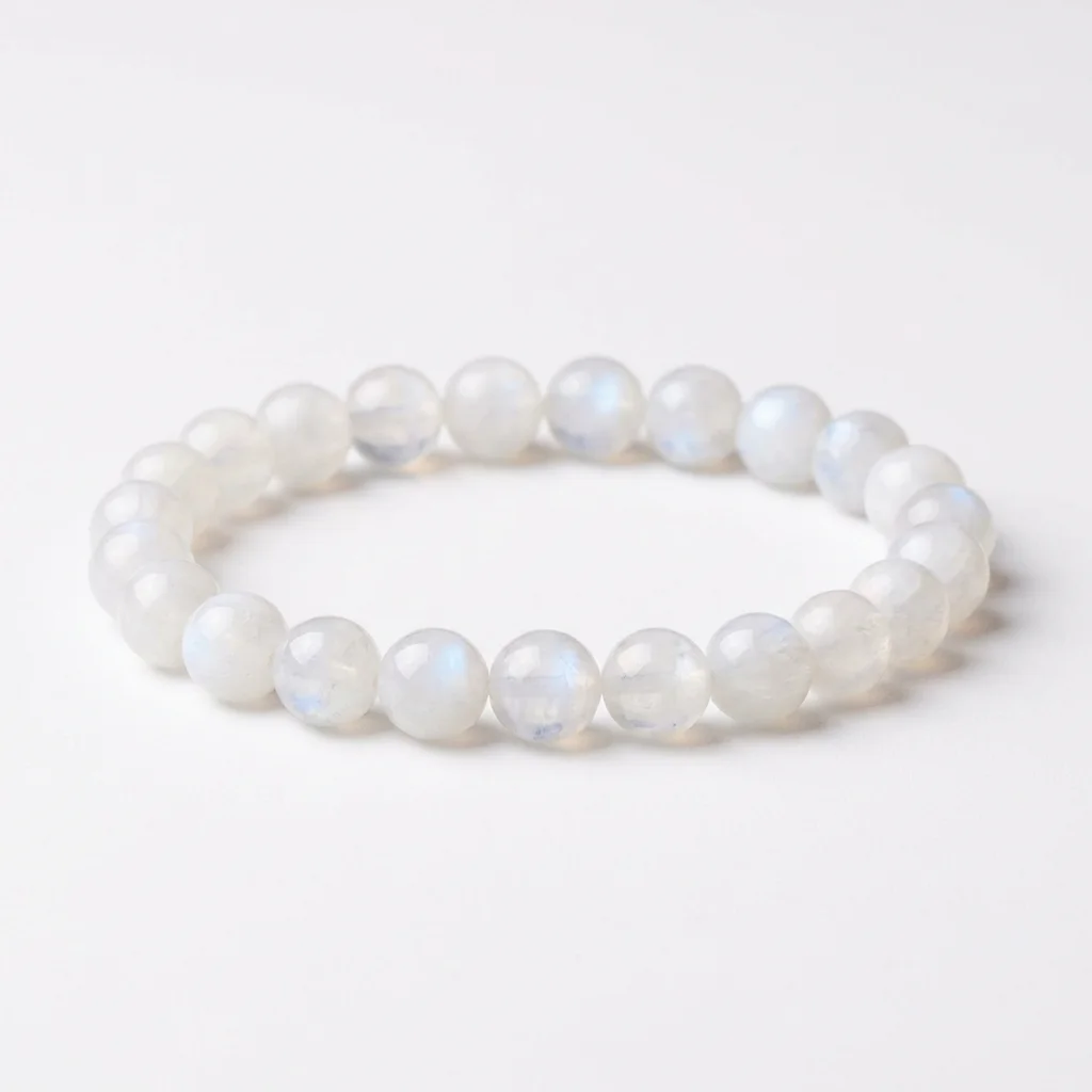 Moonstone captivates with its otherworldly adularescence. This 8mm bracelet connects you to the cycles of the moon and the divine feminine.