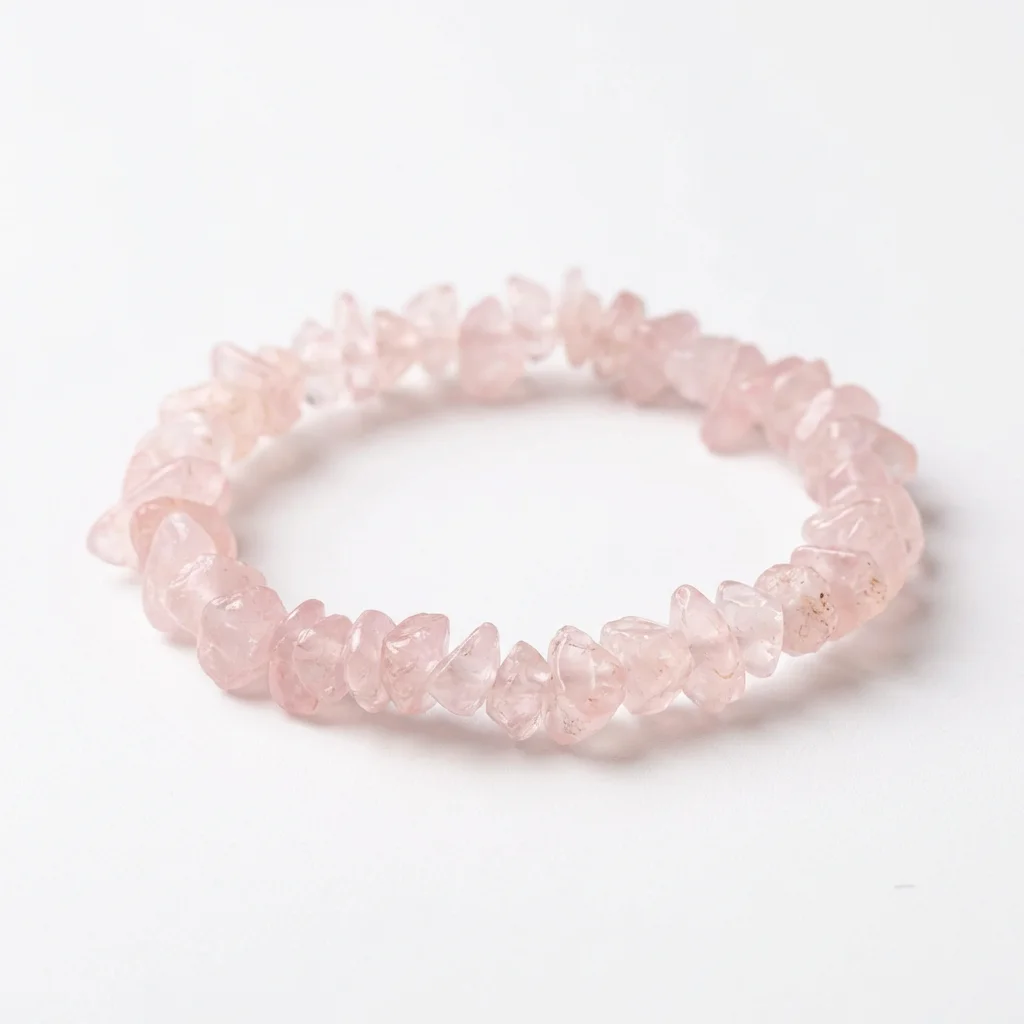 Our Rose Quartz chip bracelet celebrates the stone’s natural beauty in its most authentic form.